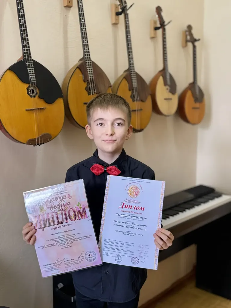 👏🏻Наш юный домрист Александр Латошин, ученик 3-го класса отделения народных инструментов, показал себя с лучшей стороны на двух музыкальных конкурсах. Александр стал лауреатом II степени на Международном конкурсе-фестивале «Мелодия весны» и завоевал диплом лауреата III степени на конкурсе «Весенний солнцеворот».